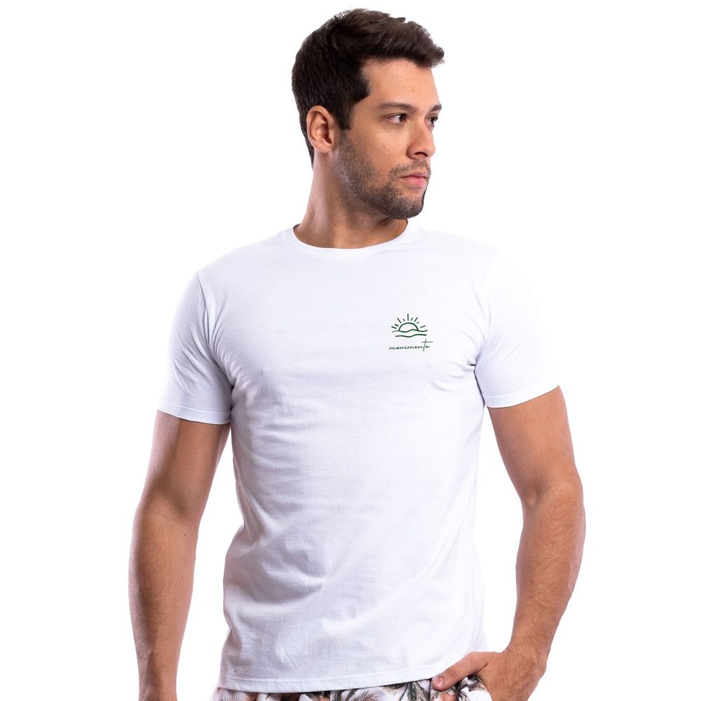 Camisa Masculina em algodão, gola redonda e mangas curtas, tecido na cor branca com estampa de sol e ondas nas costas e estampa de um sol nascente na parte da frente, na altura do peito, com a logo da Movimento também estampada.