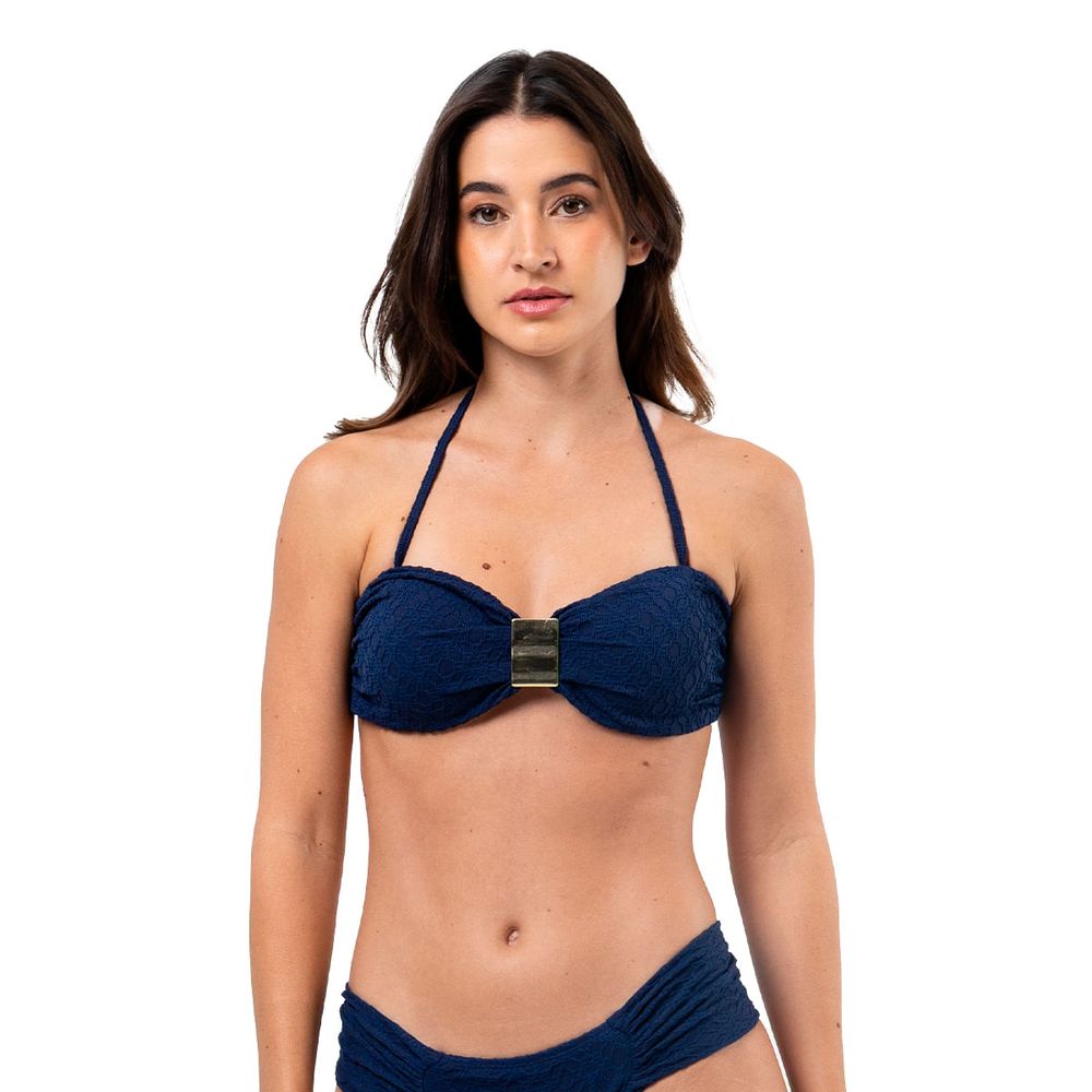 O Top Celina traz uma modelagem versátil que permite duas formas de uso: com alças ou estilo tomara que caia. O acessório central banhado a ouro destaca o decote com elegância, enquanto o tecido texturizado em azul profundo confere sofisticação ao visual. O amarrador nas costas proporciona ajuste confortável e seguro.