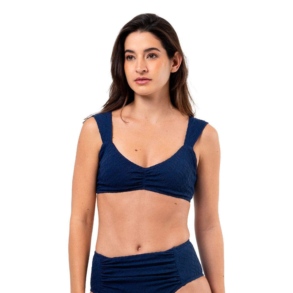 Com decote em V e alças largas que valorizam o busto com conforto, o Top Jasmine traz um franzido sutil no centro e fecho nas costas, equilibrando sustentação e estilo. O tecido texturizado em azul intenso realça o design moderno e elegante da peça.