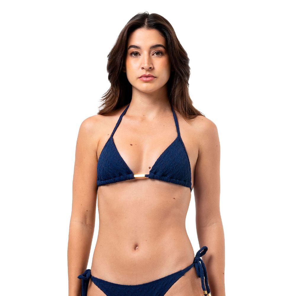 O Top Sara é um modelo cortininha clássico com ajuste por amarração no pescoço e nas costas, permitindo adaptação perfeita ao corpo. O detalhe central banhado a ouro adiciona um toque de elegância à peça, contrastando com a textura sofisticada do tecido azul.